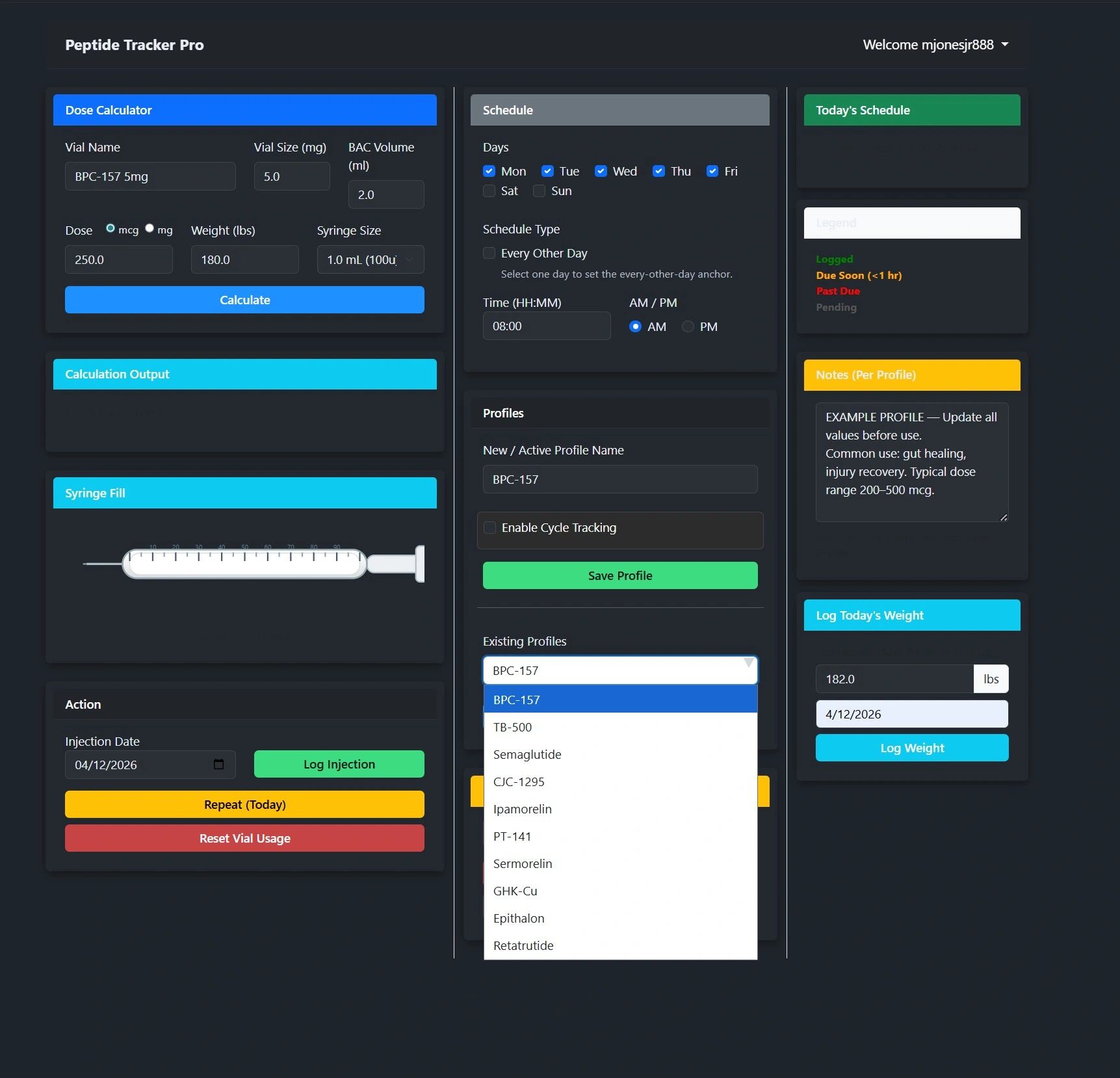 Profiles allow you to keep everything neatly separated and organized—especially if you're tracking multiple peptides or protocols.